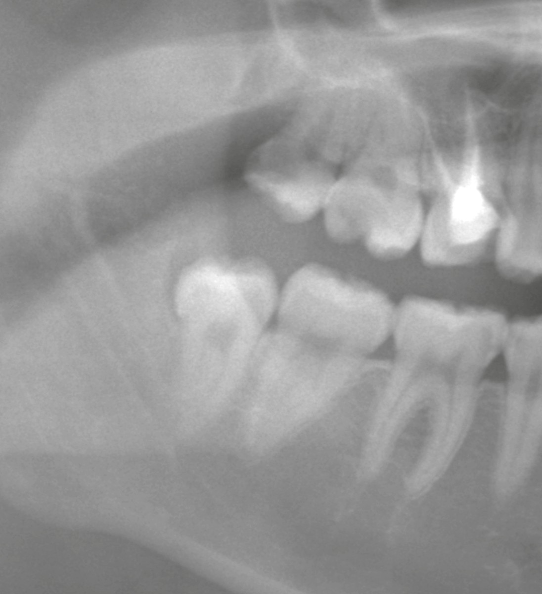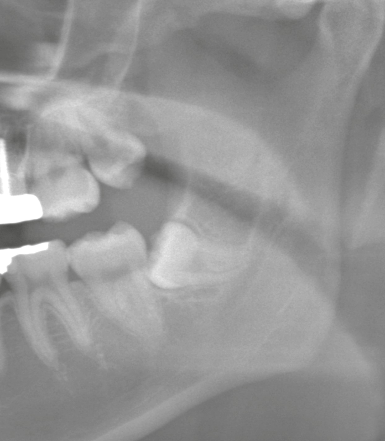 * 右下親知らず:垂直に生えているものの、歯の後ろ側(遠心歯冠部)が骨に覆われている状態