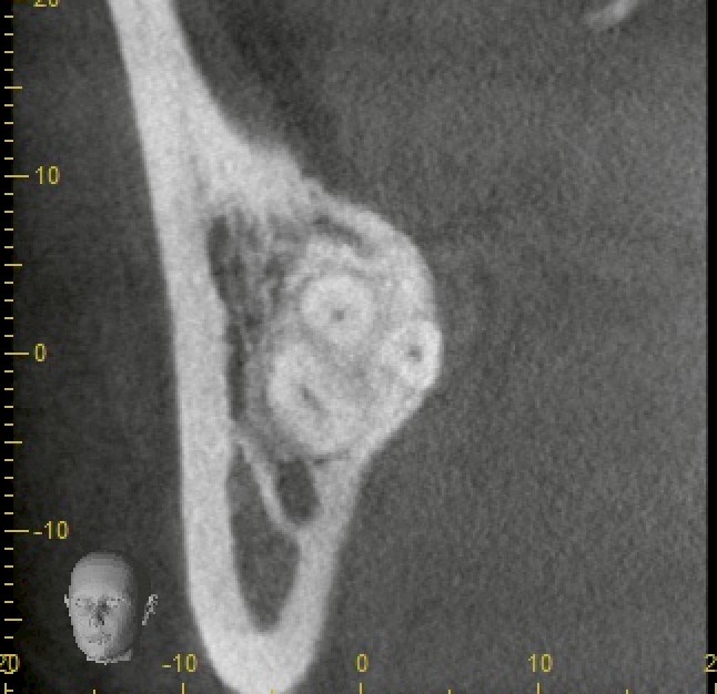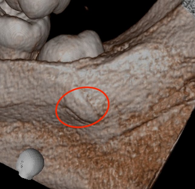CTの3D像の通り、舌側根は内側方向へ大きく巻き込んでおり、抜くには相当量の骨削除が必要。