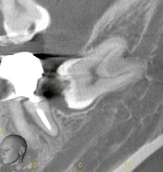 CTでは、親知らずの歯冠部だけでなく、根の周囲にも明らかな異常像がみられました。