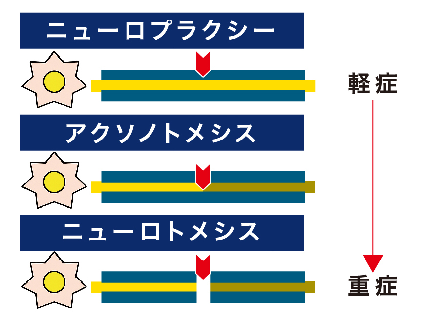 * Neurotmesis(ニューロトメシス):神経が完全に断裂。自然回復は困難で手術が必要になることもあります