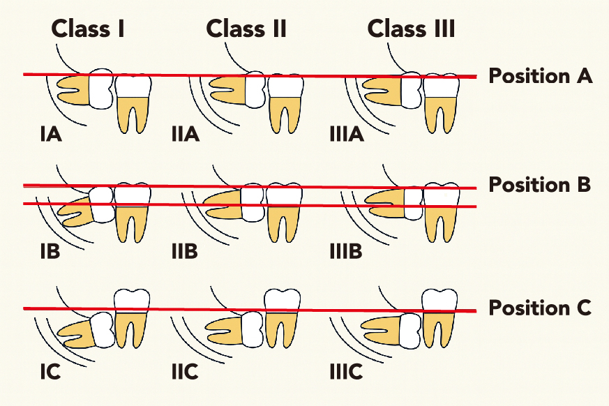 「Class III C」のように スペースがなく、しかも深く埋まっている親知らず が最も難しく、「Class I A」のように スペースがあり、浅い位置にある親知らず が最も簡単に抜歯できます。